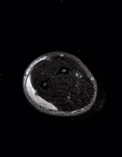 En el tejido celular subcutáneo del codo, tercio proximal y medio del antebrazo existe una colección superficial a la musculatura que tiene intensidad de señal heterogénea por zonas de menor intensidad de señal hacia la periferia, tiene medidas aproximadas de 19 x 5.4 x 1.2 cm con un volumen aproximado de 64.39 cm³.