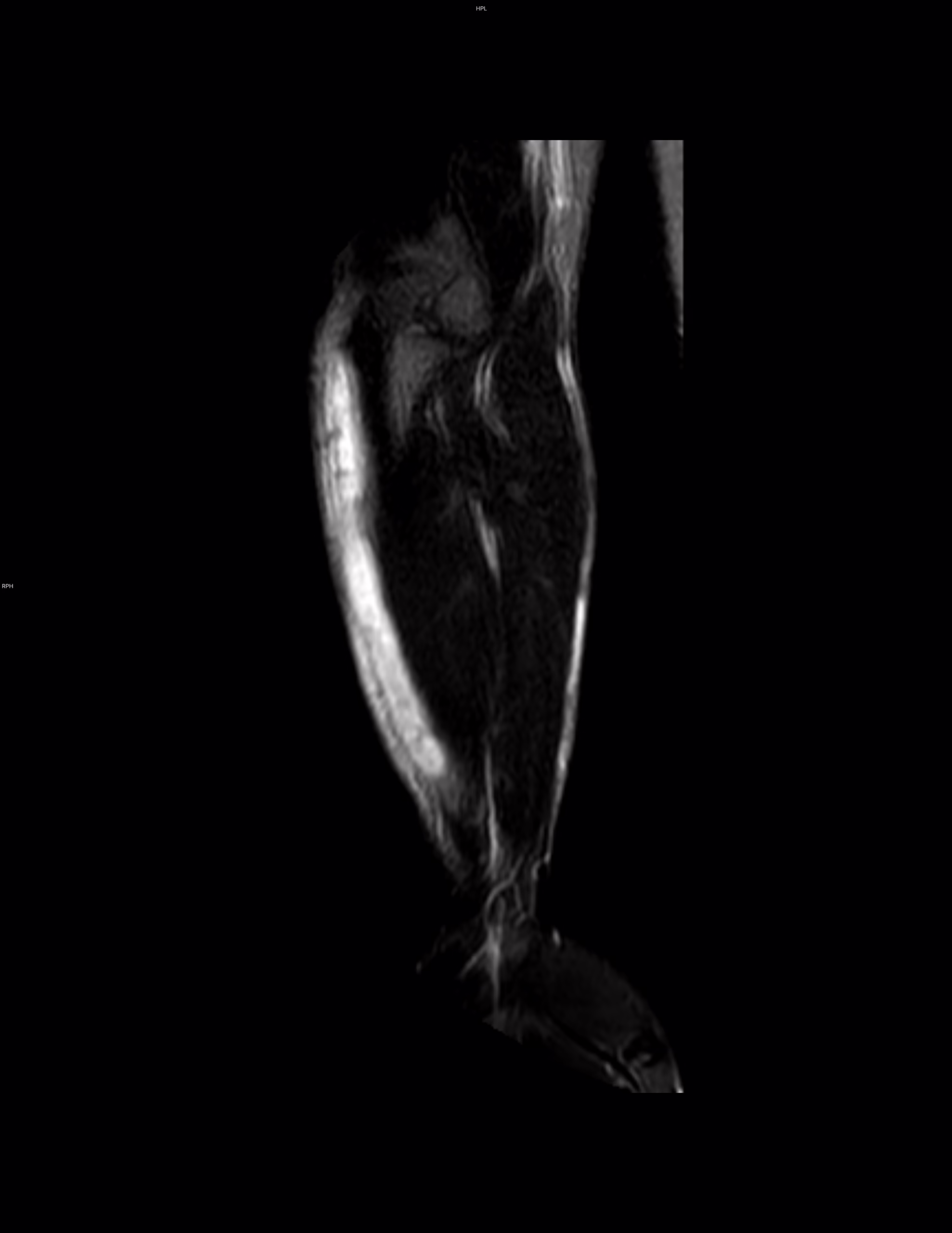 antebrazo existe una colección superficial a la musculatura que tiene intensidad de señal heterogénea