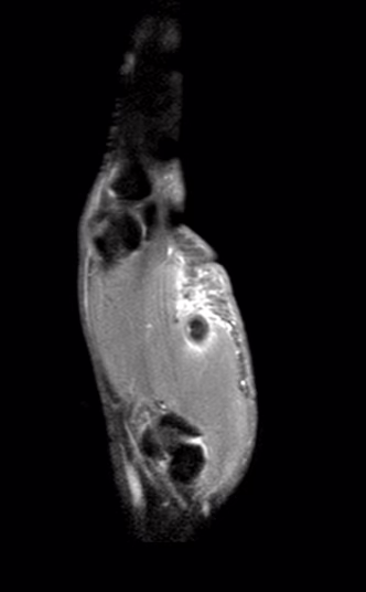Es llamativo el aumento de la intensidad de señal del tejido celular subcutáneo en la región tenar de la mano y en el primer dedo.