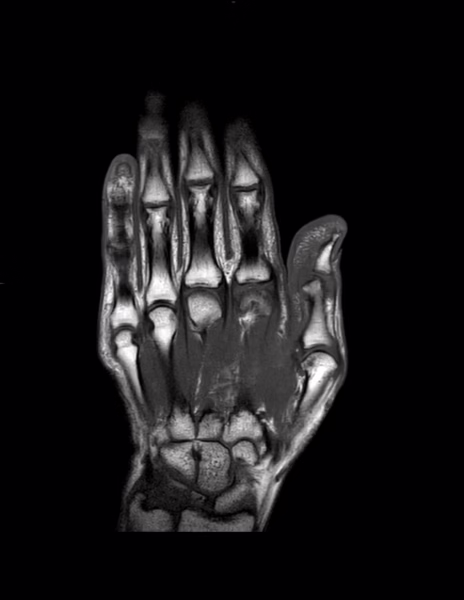 Técnica: Se realizó resonancia magnética de la mano izquierda en resonador de 1.5 teslas, con secuencias T1, T2, densidad protónica con y sin saturación de la grasa.