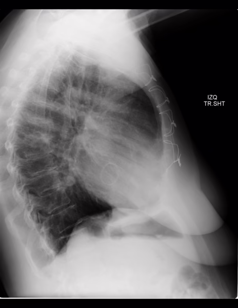 -Estructuras óseas, sin evidencia de lesiones líticas, blásticas o perdida de la contigüidad. Existen escasos osteofitos marginales. Existe material metálico a nivel de esternón.
