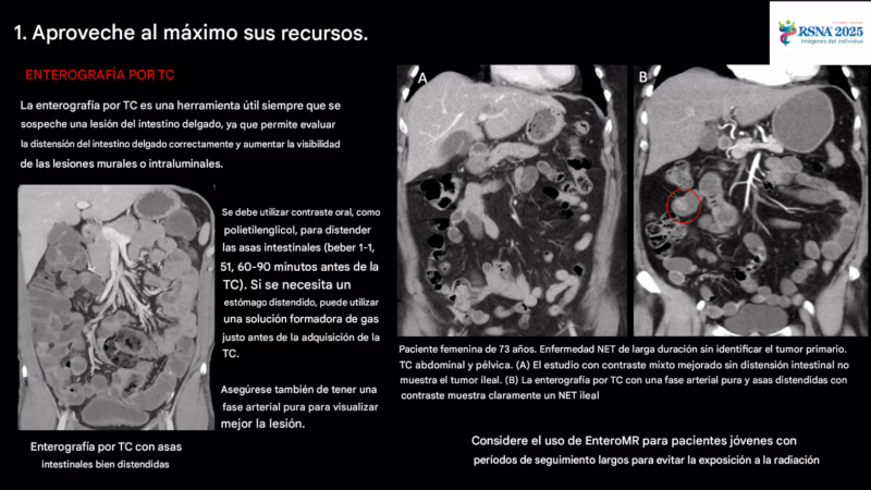 La enterografía por TC es una herramienta útil siempre que se sospeche una lesión del intestino delgado, ya que permite evaluar la distensión del intestino delgado correctamente y aumentar la visibilidad de las lesiones murales o intraluminales.
