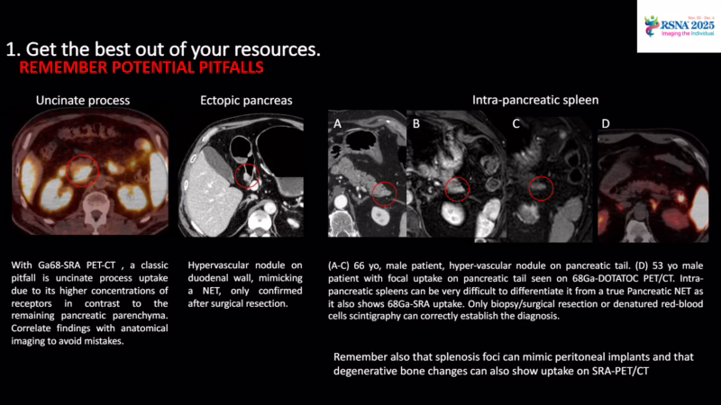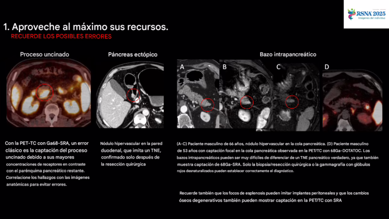 Con la PET-TC con Ga68-SRA, un error clásico es la captación del proceso uncinado debido a sus mayores concentraciones de receptores en contraste con el parénquima pancreático restante. Correlacione los hallazgos con las imágenes anatómicas para evitar errores.