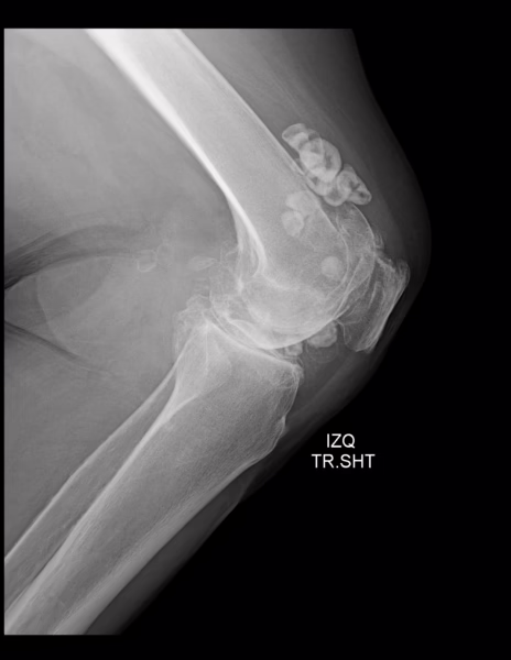 CALCIFICACIONES PERIARTICULARES EN TEJIDOS BLANDOS DE PREDOMINIO EN GRASA SUPRAPATELAR BILATERAL DE PREDOMINIO EN RODILLA IZQUIERDA.