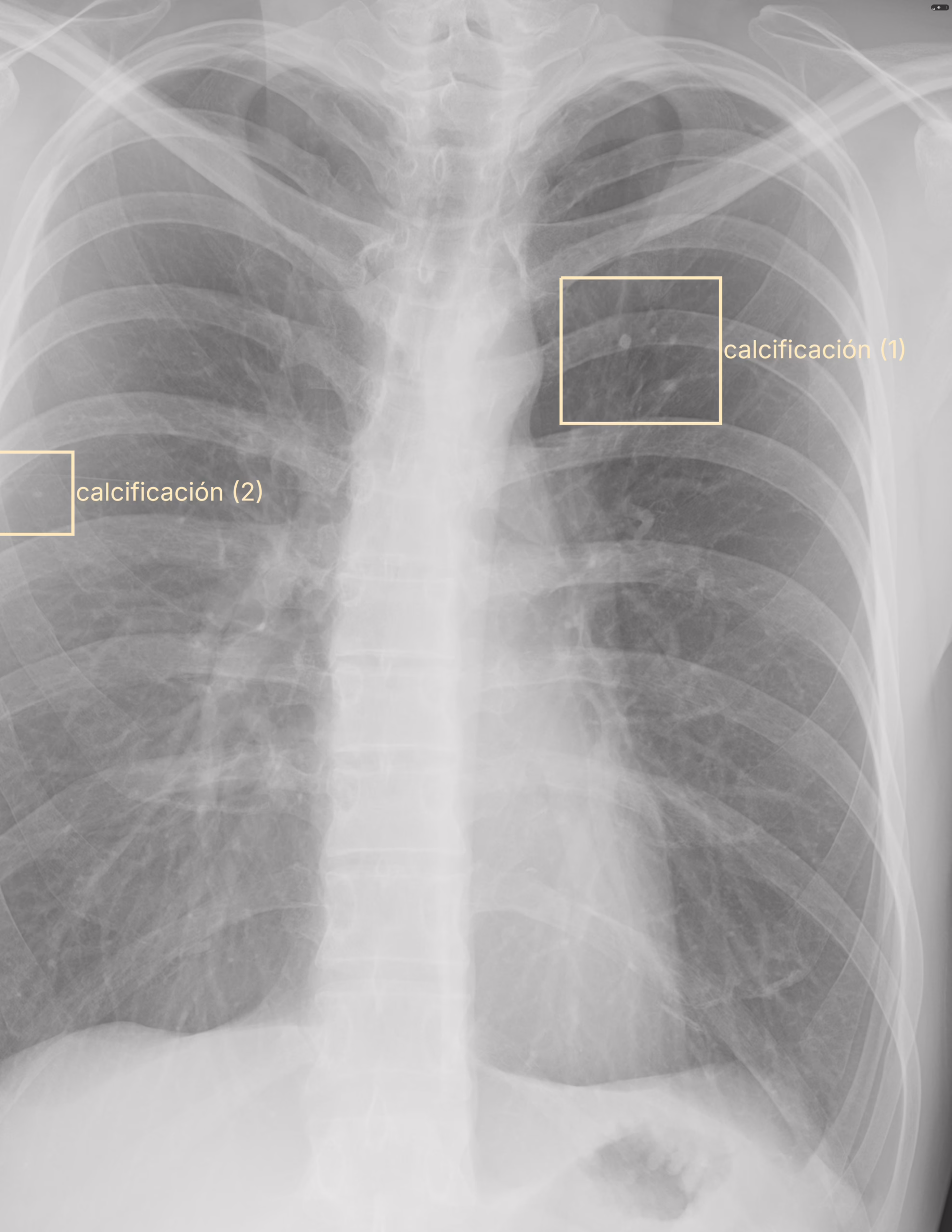 Los pulmones son simétricos y radiolucidos, de manera bilateral en los tercios medio se observa calcificaciones menores a 0.5 cm. No se identifican patrones radiopacos o radiolucidos por este método de estudio. El diafragma conserva la convexidad. Los ángulos diafragmáticos conservan la profundidad.La tráquea se encuentra central con presencia de aire. El arco aórtico se encuentra normal. La silueta cardiaca es homogénea.Los hilios son de diámetro normal y situación anatómica normal.