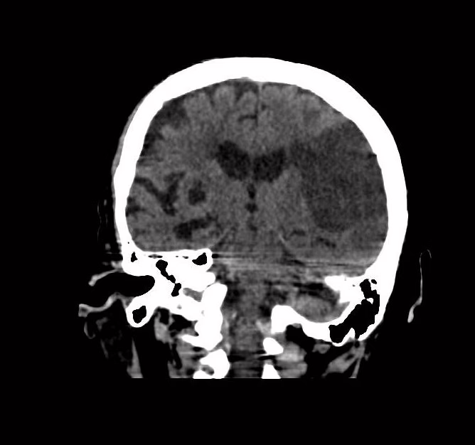 EN EL PRESENTE ESTUDIO TOMOGRAFICO, EXISTEN EVENTO VASCULAR ISQUÉMICO AGUDO A NIVEL DE LÓBULO FRONTAL, PARIETAL Y TEMPORAL IZQUIERDO, ASÍ COMO TAMBIÉN EVENTO LACUNAR AGUDO A NIVEL DEL NÚCLEO CAUDADO IZQUIERDO, ESTOS CON EDEMA ASOCIADO.