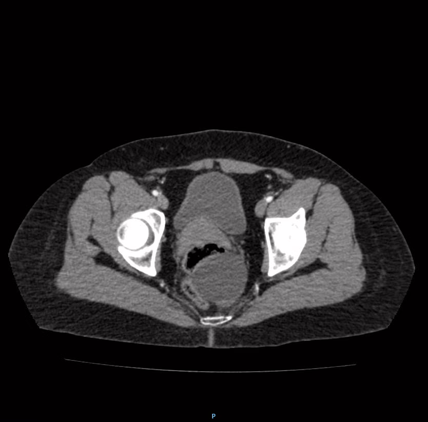 En espacio pre sacro posterior a ámpula rectal, con presencia de imagen redondeada, regular, bien definida, de contenido hipodenso (3 UH), tras la administración de contraste sin evidencia de realces, que mide 5.3 X5.14X 5.6 cm, en su eje longitudinal, anteroposterior y trasversal respectivamente con volumen aproximado de 80 cc.